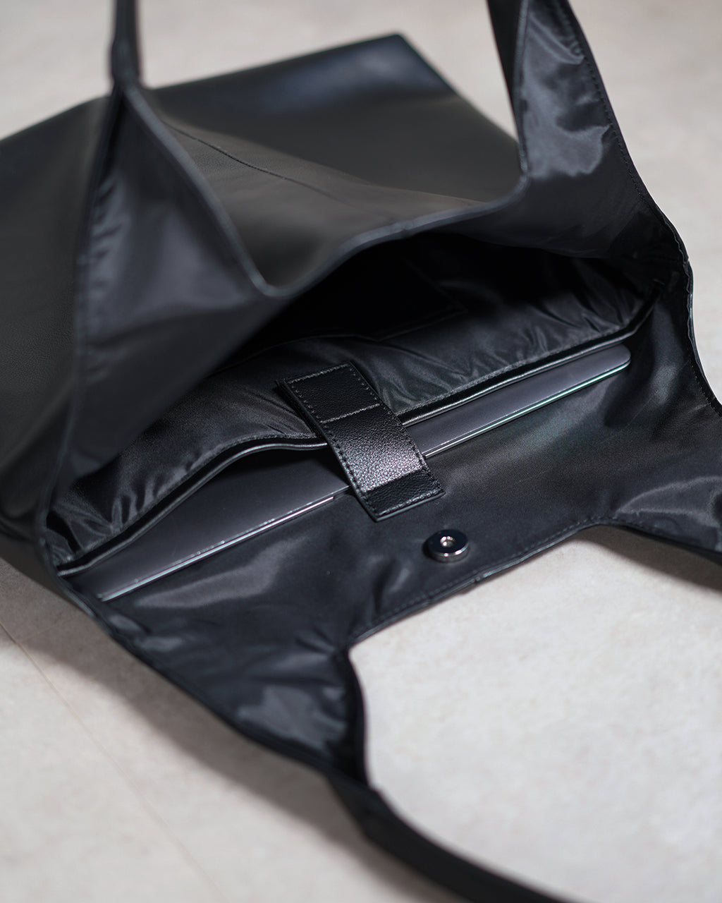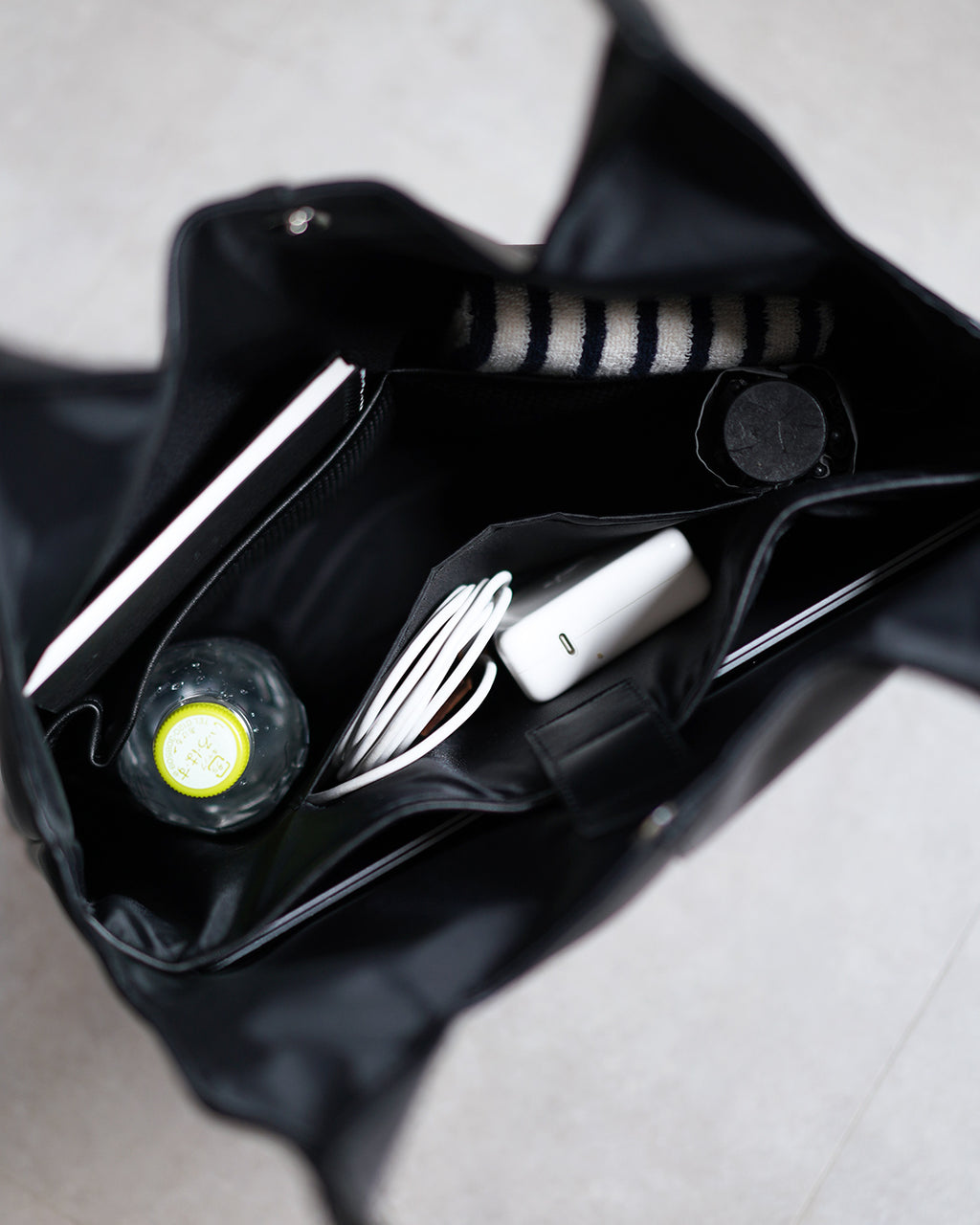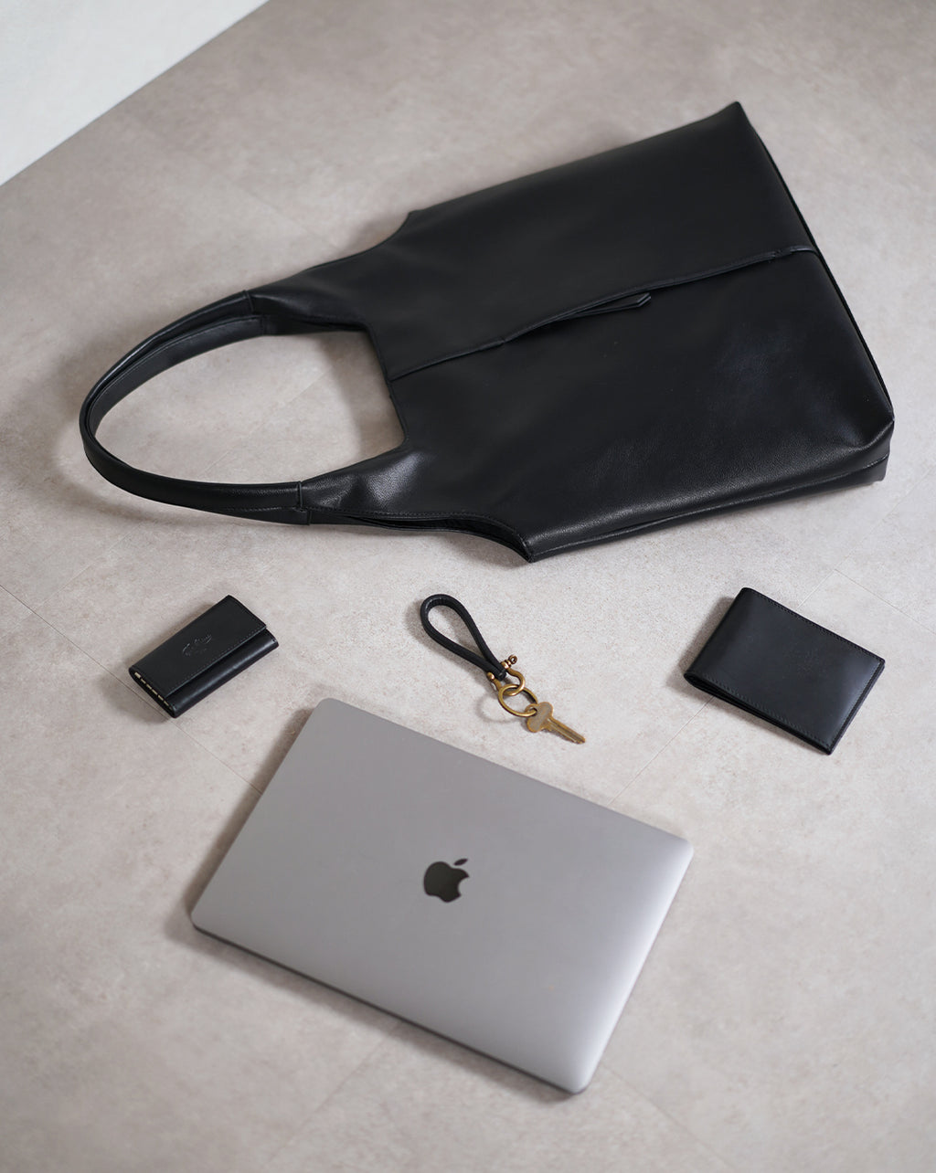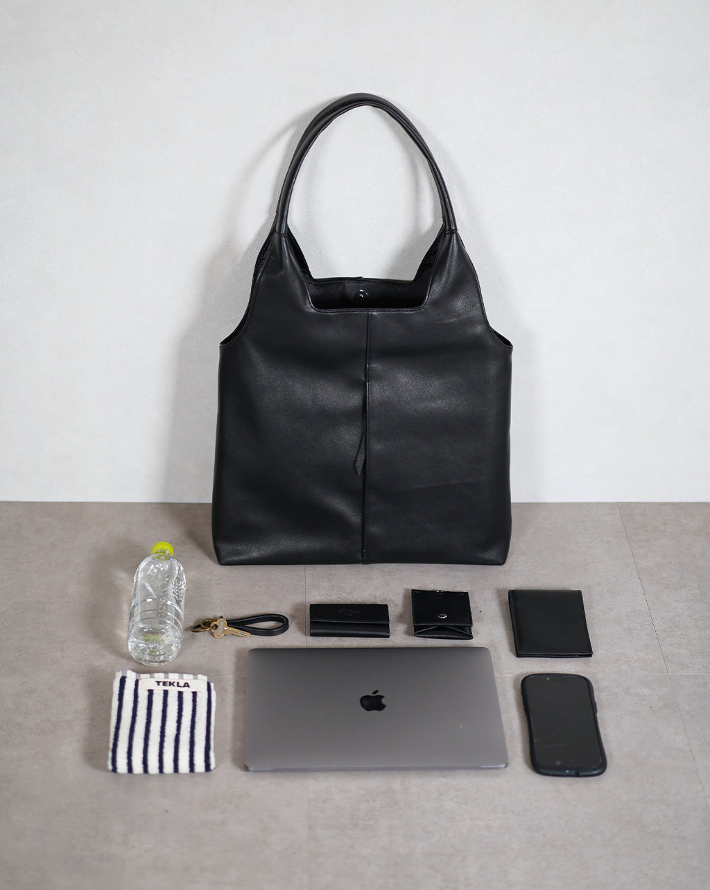スーツやジャケットに似合う、縦長でスマートなシルエットの本革ビジネストートバッグ。 外装はシンプルでミニマルなデザインに仕上げ、本革ならではの上質さと高級感を引き立てました。ハンドルは、手持ち・肩掛けの両対応設計で、通勤から出張まで幅広く活躍します。素材には、柔らかく手触りの良いスムース本革を採用。防水加工を施しているため、雨の日もケアレスで使用できます。本革でありながら軽量設計で、毎日の持ち運びも快適です。内装には撥水ナイロンを使用し、ドリンクの結露や雨による浸水も防止。15インチPC・A4書類が収納可能で、1〜2泊の出張にも対応する収納力を備えています。