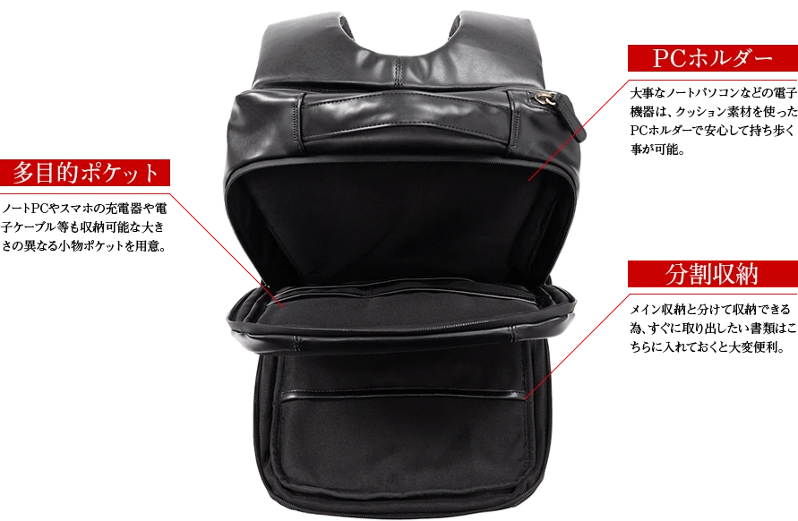 収納が2層式に分かれるバックパック。撥水性に優れている素材で天候の悪い日でも安心して持ち歩けます。メイン収納はパソコンやiPadなどのタブレットも収納でき、大容量タイプのリュック。13インチのノートパソコンが楽々収納可能。前面収納にはスマホや小物収納に便利な、小物ポケットを完備。定期入れなどの小物の収納に大変便利です。メイン収納のPCホルダーは背面収納からも取り出せる。背負ったまま取り出せるのが魅力。サイドには500mlペットボトルや水筒、折り畳み傘などを収納できるポケットを2つ完備。背面には、厚めのメッシュクッションを使用し、ムレにくく背中にしっかりフィット。チェストベルトつきで、リュックが体にフィットし長時間使用しても疲れにくい仕様。